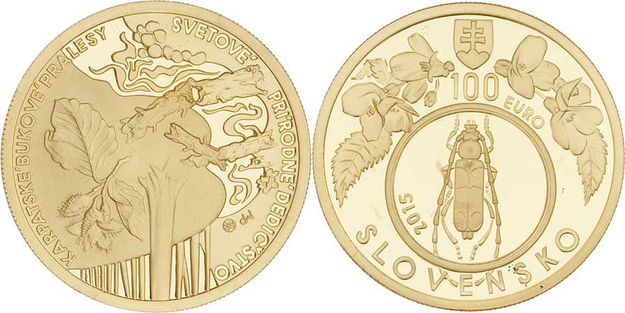 100 Euro 2015 - Karpatské bukové lesy, KM.0-nové (Au900, 9.50g, pouze 5.000ks), kapsle, etue, certifikát, reklamní prospekt
