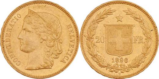 20 Frank 1896 B, KM.31.3 (Au900), 6.455g, nep.hr., nep.rysky, pěkná patina, téměř