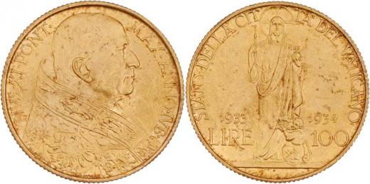 100 Lira 1933/1934 - jubilejní rok, Y.19 (Au900, pouze 23.000 ks), 8.798g, pěkná patina R!