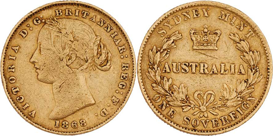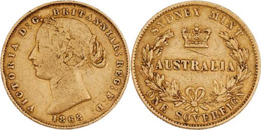 Libra 1868 - s nápisem "AUSTRALIA", Sydney, KM.4 (Au917), 7.941g, dr.hr., dr.rysky, pěkná patina R!