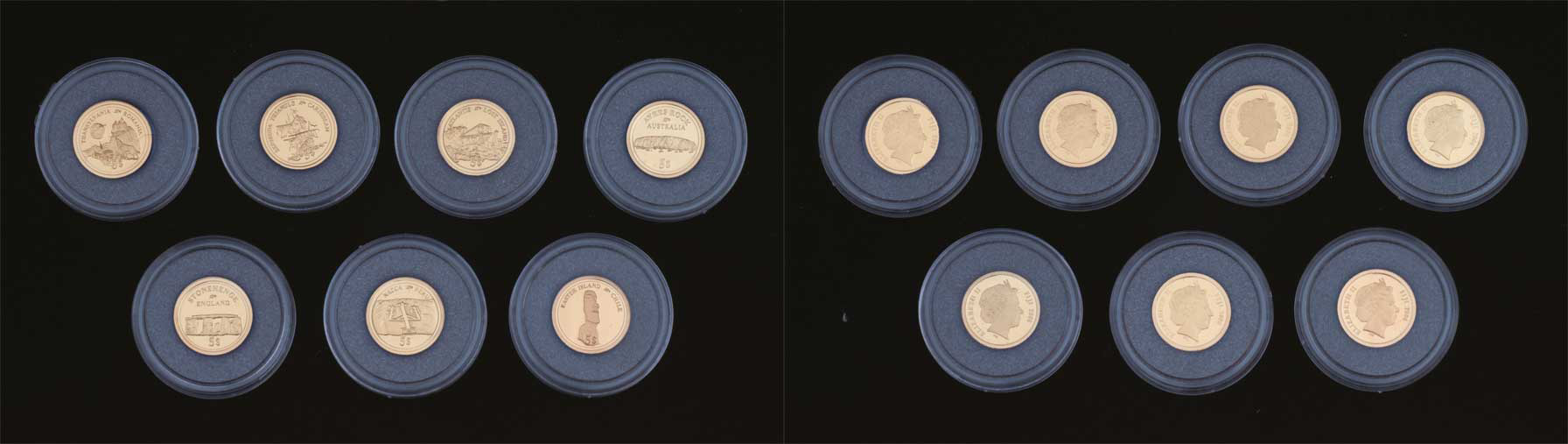 5 Dolar 2006 - série pamět. mincí - největší záhady světa - 7ks, Au585, 1.25g, 7x kapsle, 7x "certifikát" (Národní pokladnice), společná etue s lupou