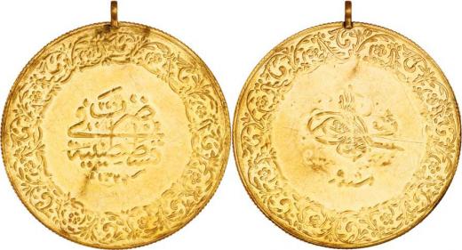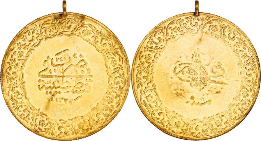 250 Piastr AH.1327, 5.rok vlády (= 1913) - orientální napodobenina s ouškem, hmotnost pouze 5.051g, výdajová boleta Puncovního úřadu (Au870)