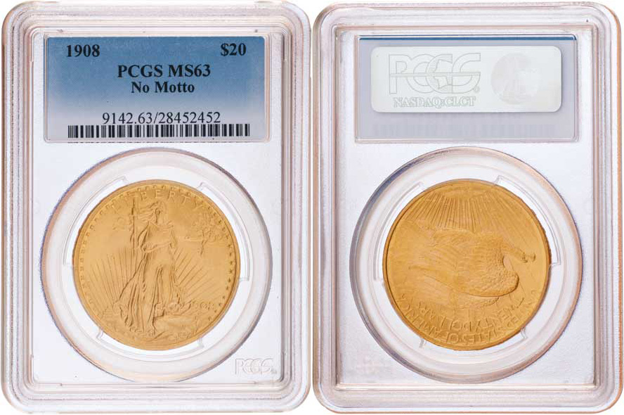 20 Dolar 1908 - stojící Liberty, KM.127 (Au900, 33.43g), mince je zatavena v etui PCGS (MS63), téměř