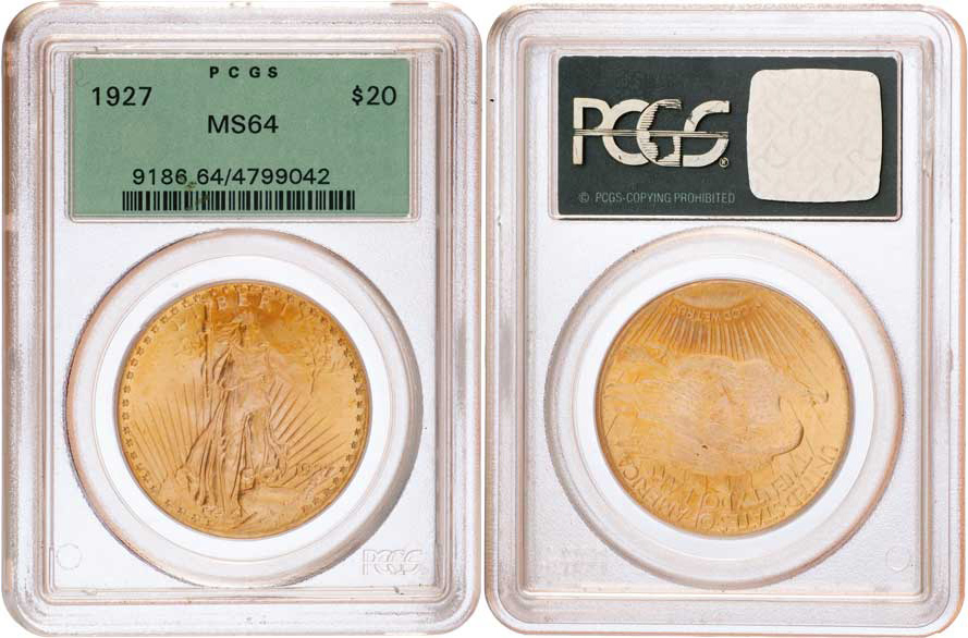 20 Dolar 1927 - stojící Liberty, KM.131 (Au900, 33.43g), mince je zatavena v etui PCGS (MS64)