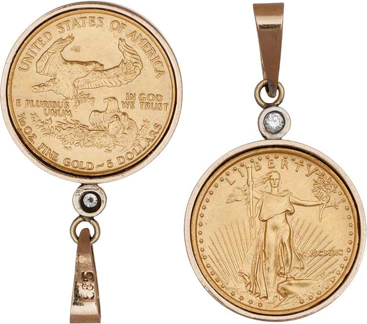 5 Dolar (1/10 Unce) 1990, KM.216, v závěsném rámečku Au585 s malým briliantem, celková hmotnost 4.613g