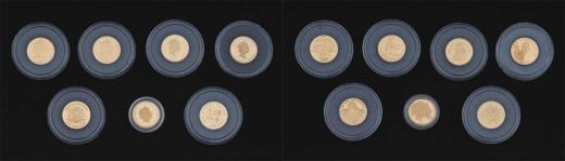 a Tuvalu - série 7ks pamět. mincí z let 2006 - 2010, Au999, 1.24g, 7x kapsle, 7x "certifikát" (Národní pokladnice)