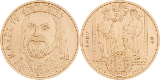 Fojtů - 5 Dukát 2016 - Karel IV.- poprsí zleva, opis/ král a královna, znak, pečeť, Sign., Au986, 34mm, 17.510g, kapsle, etue, certifikát, číslo 49/80 RR!
