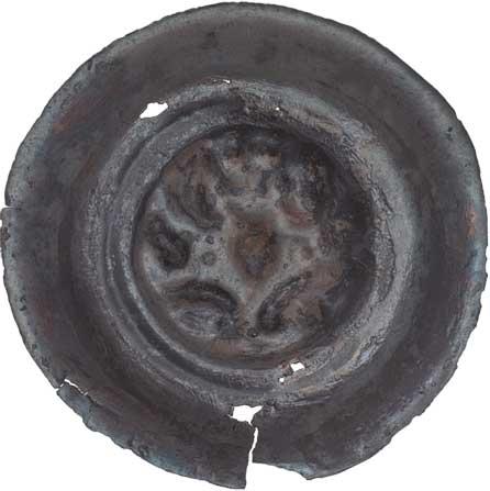 Brakteát český, Ca.872, F.XXII/28 (2234), 0.622g, několikrát perforov. ražbou, naprasklý, tmavá patina
