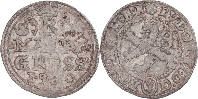 Malý groš 1580, K.Hora-Šatný, HN.2b (opis 7a), nápis "* MALEY */ GROSS / 1.5.8.0 ", 0.903g, nep.nedor., pěkná patina