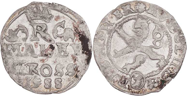 Malý groš 1588, K.Hora-Šatný, HN.1b (opis 7a), nápis " MALEY / GROSS / 1588 ", 0.992g, mírně exc., nedor., nep.dvojráz, skvrny