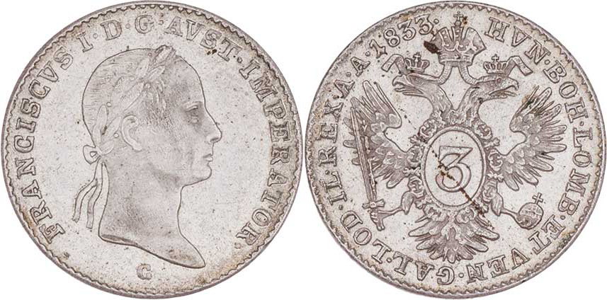 Ag 3 Krejcar 1833 C, 1.676g, nep.hr., nep.rysky, skvrnky, patina R!