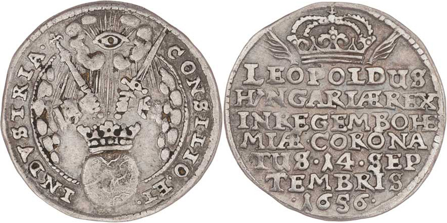 Střední jeton na korunovaci v Praze 14.IX.1656 - korun.zeměkoule, ruce s žezly, Boží oko, opis/ koruna a nápis, Ag 21mm, 1.976g, ČS.738, Don.2458, Nov.D.4b