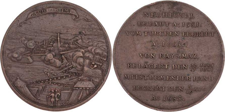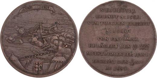 Nesign. - osvobození Nových Zámků od Turků 1685 - pohled na obležené opevněné město, nápis na stuze / 9-řádkový nápis, měď 37mm, 17.514g, M.954, patina R!