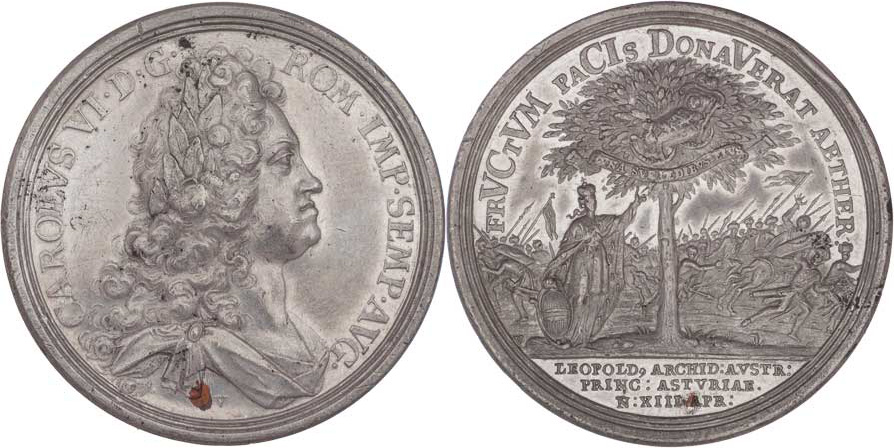 Vestner - cín. medaile na naroz. prince Leopolda 1716 - poprsí zprava, opis / kolébka na stromě, císař, vojsko, písmo, 44mm, 28.386g, M.1446(AR), hr., patina
