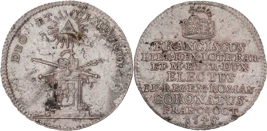 AR menší jeton na korunovaci ve Frankfurtu 4.X.1745 - Boží oko, korunov.klenoty na oltáři, opis / koruna, 8-řád.nápis, Ag 21mm, 1.960g, M.1764, Nov.D.19b, pat.