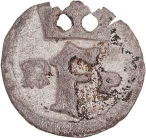 Malý peníz b.l., K.Hora, J.1b, MKČ.82, 0.268g, dírky v koruně perforovány ražbou, nepravid.okraj, patina