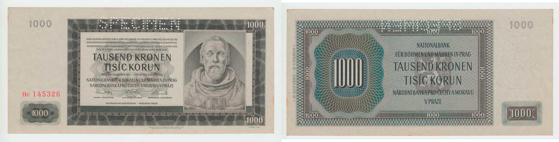 1000 Koruna 1942 - 3.vyd.- sér.Hc, BHK.39b "SPECIMEN"