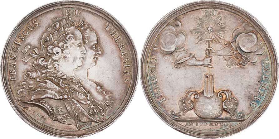 Wurschbauer - medaile na jubil.rok 1750 - dvojportrét a opis / dvě Boží ruce drží kormidlo nad zeměkoulí, opis, Sign., Ag 50mm, 43.022g, M.1818, H.2901, rysky