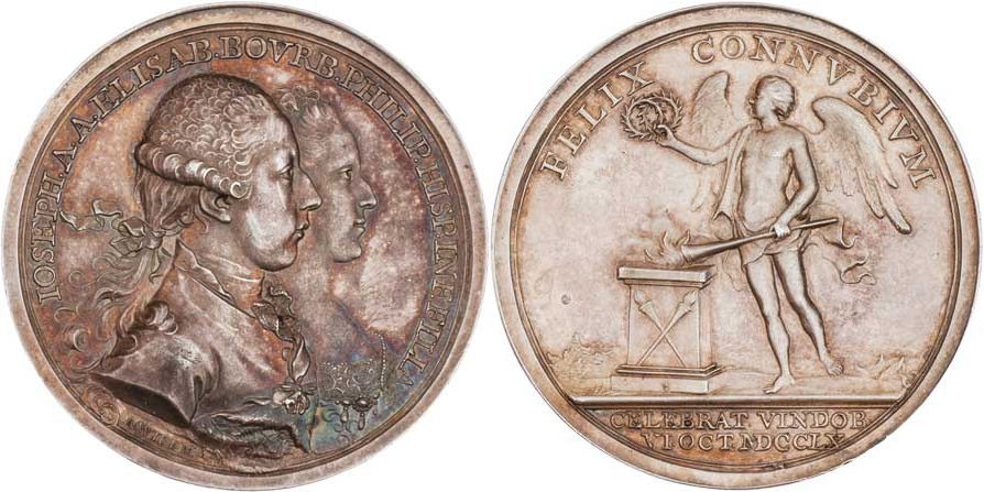 Wideman - AR medaile na svatbu ve Vídni 6.10.1760 - dvojportrét zprava, opis/ genius s pochodní u oltáře, písmo, Sign., 39mm, 26.177g, M.1891, H.3115, patina