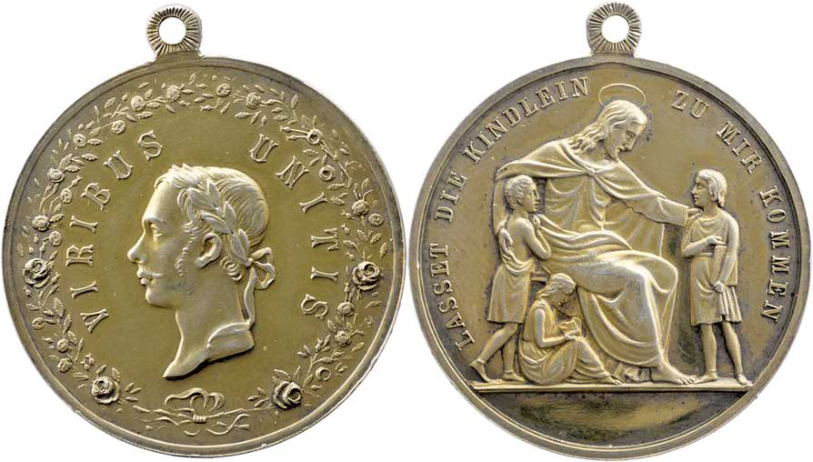 Nesign. - Nechte maličkých přijíti ke mně b.l. - hlava císaře zleva a opis ve věnci / Kristus s dětmi, opis, zlacené stříbro 35 mm s původ. ouškem, 11.595g