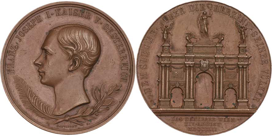 Radnitzky - AE medaile na návrat císaře do Vídně 1852 - hlava zleva, ratolesti, opis/ vítězný oblouk, opis, nápis, Sign., 50mm, H.3758, nep.hr., nep.rysky, téměř