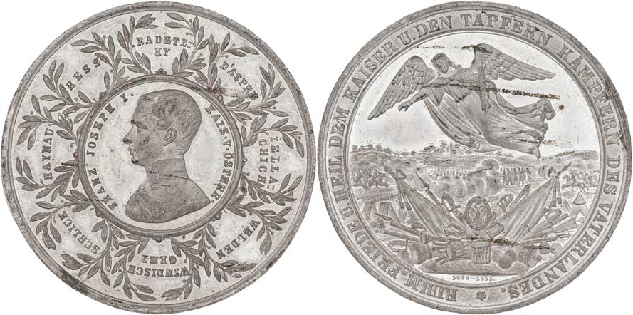 Nesign. - medaile na 5.výročí vlády, 1848 - 1853 Poprsí zleva, vavříny a jména generálů / anděl nad bojištěm, německý opis, cín 40 mm, dr.hr., dr.rys. R!