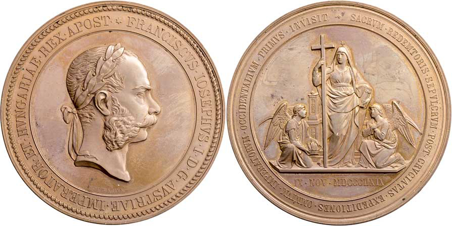 Tautenhayn - návštěva Božího hrobu v Jeruzalémě 1869 - portrét zprava, opis/ personifikace Víry mezi dvěma anděly, opis a nápis, měď 72mm, 122.907g, H.3806(AR)