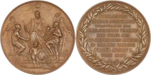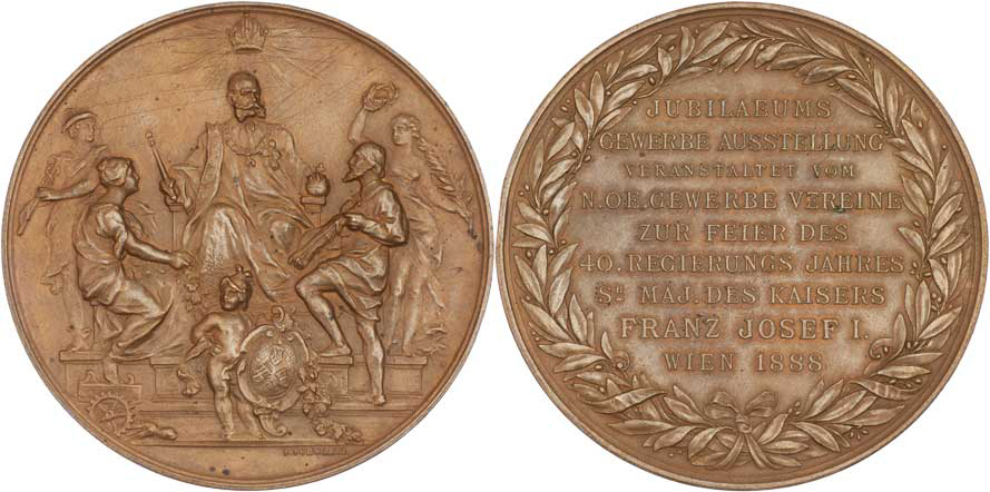 Schwartz - jubilejní živnost. výstava ve Vídni 1888 - císař na trůnu a čtyři postavy / 9-řádkový nápis ve vavřín. věnci, Sign., bronz 64 mm, dr.hr., vl.rysky