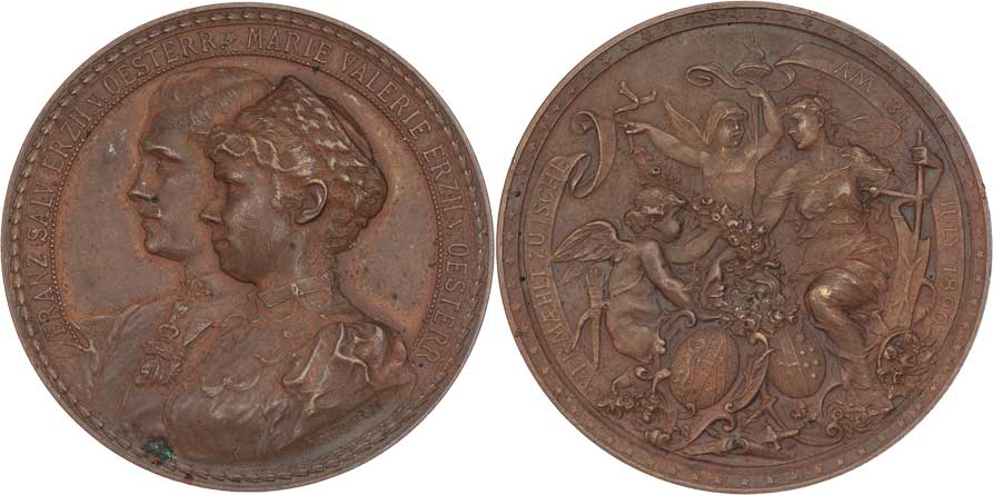 Scharff - AE medaile na svatbu v Ischlu 31.VII.1890 - dvojportrét zleva, opis / alegorie, znaky, nápis na stuze, Sign., 43mm, 32.168g, Haus.408, skv.,pat.,tém.