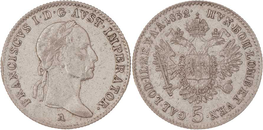 5 Krejcar 1832 A, 2.205g, nep.vada mater., nep.rysky, patina, lakovaný R!