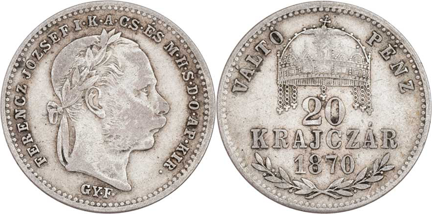 20 Krejcar 1870 GYF - krátký opis, 2.624g, nep.hr., nep.rysky, patina R!