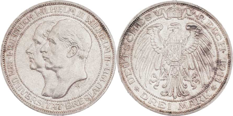 3 Marka 1911 A - universita Vratislav, KM.531 (Ag900), 16.674g, nep.hr., nep.rysky, patina, téměř