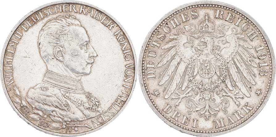 3 Marka 1913 A - 25 let vlády, KM.535 (Ag900), 16.655g, dr.hr., dr.rysky, pěkná patina