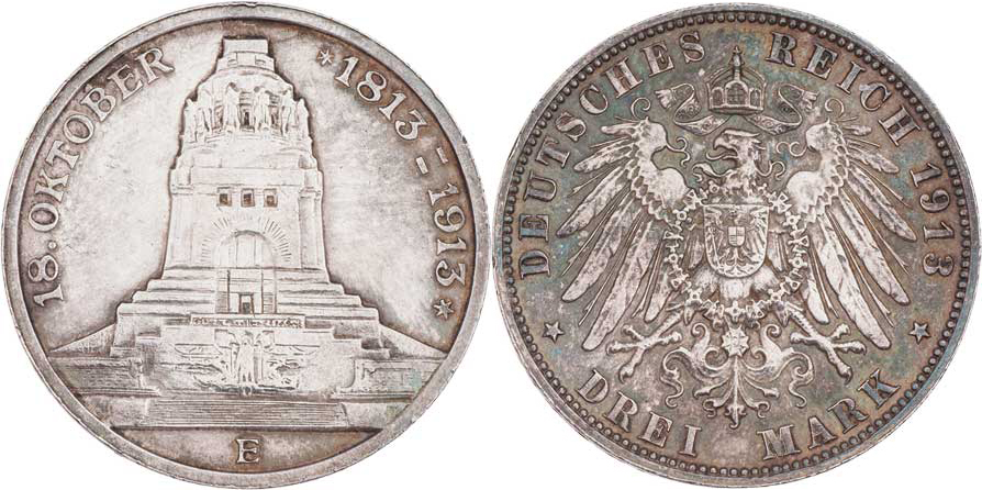 3 Marka 1913 E - památník bitvy u Lipska, KM.1275 (Ag900), 16.673g, dr.hr., nep.rysky, pěkná patina
