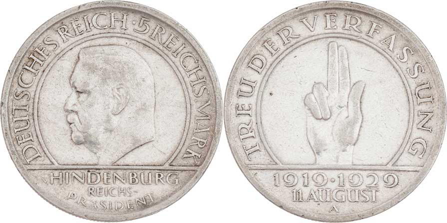 5 Marka 1929 A - Přísaha, KM.64 (Ag500), 25.050g, hr., dr.rysky, pěkná patina
