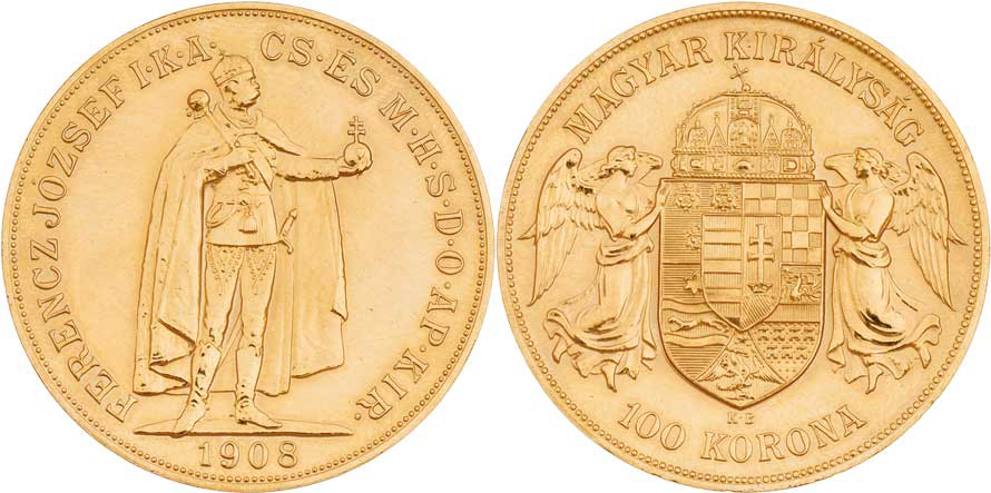 100 Koruna 1908 KB - novoražba, 33.893g, patina