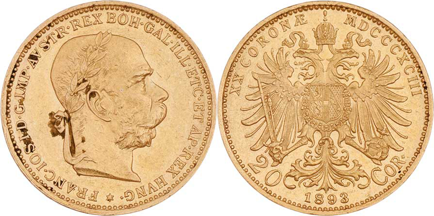 20 Koruna 1893, 6.773g, nep.hr., nep.rysky, nep.skvrnky, téměř