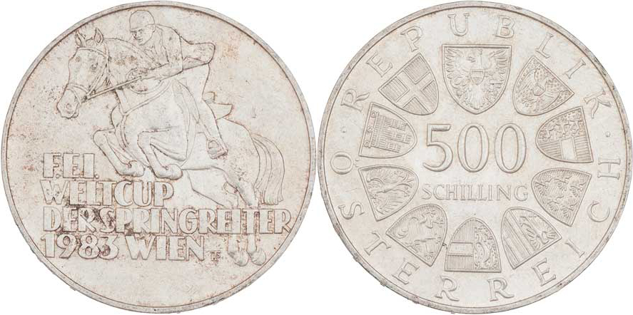 500 Šilink 1983 - Světový pohár v jezdectví, KM.2961 (Ag925, 24.00g), patina