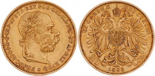 20 Koruna 1893, 6.764g, nep.hr., nep.rysky, pěkná patina