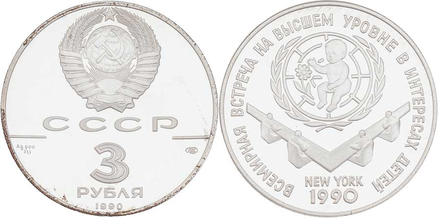 3 Rubl 1990 - Světový kongres dětských práv, Y.247 (Ag900, 34.56g, 20.000 ks), kapsle, skvrny, patina