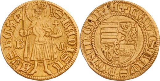 Dukát (1454-1457) B-V, Buda-Aladár Várdai, stojící sv.Ladislav, opis / čtyřdílný znak, opis, Len.29/1, Pohl.H2-7, Husz.636, Fr.16, 3.381g, pěkná patina