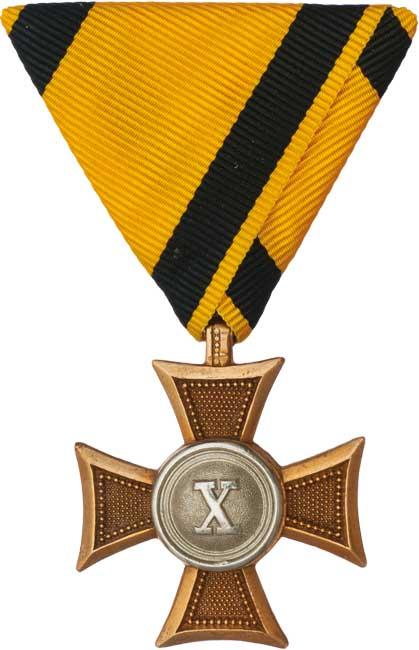 Služební kříž za 10 let - typ 1913, Marko.380b1, VM.2/8-1913-E, postříbř.středový medailon bez věnce, kříž pozlacený, původní stuha