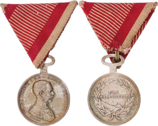 Malá stříbrná medaile za statečnost, Marko.228a, VM1.5-IX-D, typ 1867, Sign.Tautenhayn, Punc."A", elipsovité ražené ouško, rysky, patina, původní stuha
