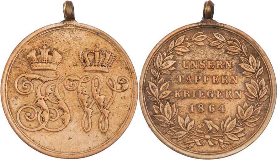 Pam.medaile na válku proti Dánsku 1864, Marko.359a, VM1.25a, bronz, rakouský typ s nápisem na hraně, přiložena původní stuha od služebního kříže