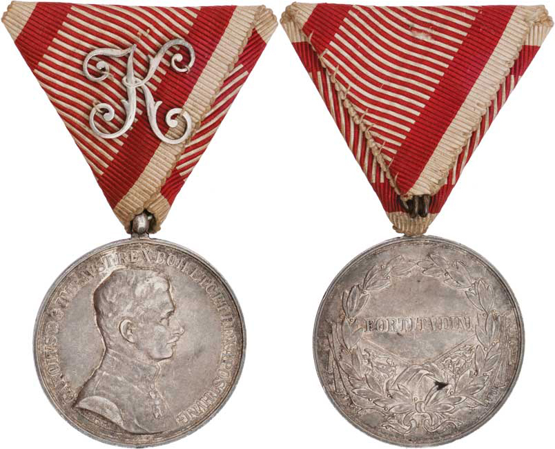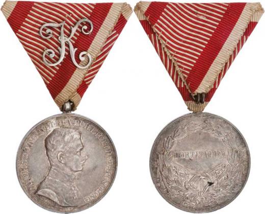 Velká stříbrná medaile za statečnost s písmenem "K" přišitým na původní stuze (pro důstojníky), Nepunc., Sign., Kautsch, VM.1/5-XIII-B, Marko.234a, rysky R!