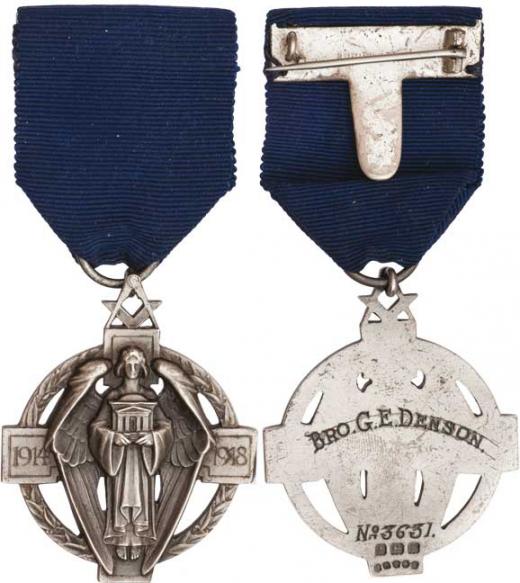 George V. - AR zednářská medaile za službu 1914-1918, udělení "Bro.G.E.Denson, No.3631", Sign.J.R.Gaunt- London, krásná etue Sign.G.Kenning and Sohn-Liverpool