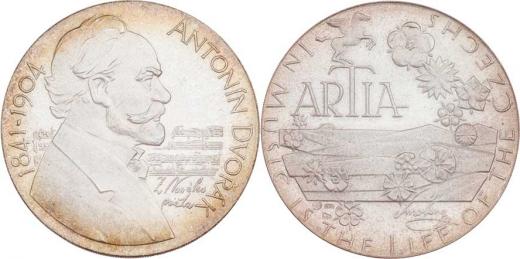 Antonín Dvořák - Artia - V hudbě život Čechů (1974) - poprsí zprava, notový zapis, opis / emblém, krajina, květiny, písmo, Sign., Ag900, 38mm, 22.020g, patina