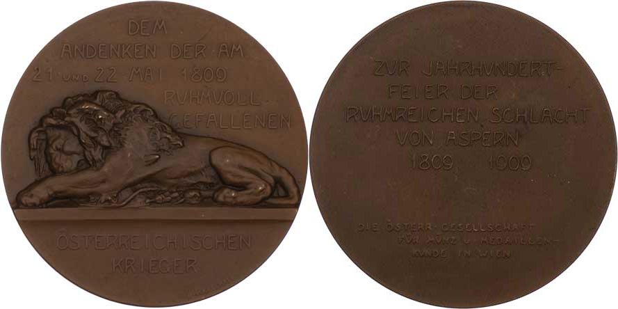 Sto let bitvy u Aspern 1809/1909 - umírající lev, 7-řádkový nápis / 8-řádkový nápis, Sign., patinovaný bronz 54 mm