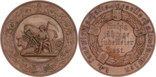 Zemědělský spolek ve Vídni - na 50 let trvání 1857 - mladík s pluhem, kosou a domácími zvířaty, ornament / nápis ve věnci a opis, Sign., bronz 68 mm, patina