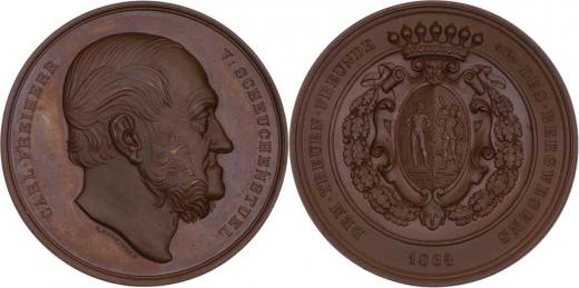 Carl, svobodný pán von Scheuchenstuel 1864 - hlava zprava, opis/ korunovaný erb v ozdobné kartuši, věnec a opis, Sign., měď 69mm, 135.738g, krásná patina